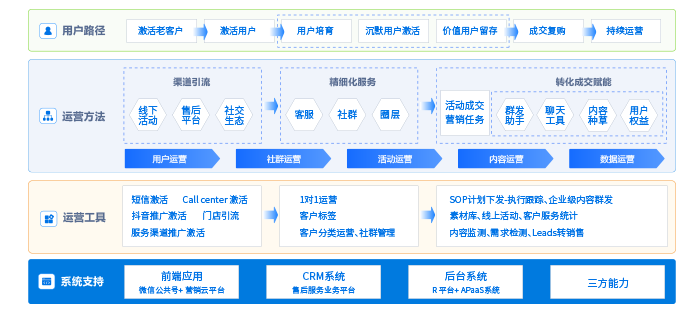很多企業對增量和存量都已經有認識,但是卻苦于不能將認識轉化為業績,很大的原因在于沒有相應的組織來負責進行增量&存量策略的運營,這也是增量&存量策略落地的第一步,當企業建立了責任組織之后,就需要一套流程體系和系統平臺來配合組織持續的進行運營,這是策略落地的第二步和第三步。