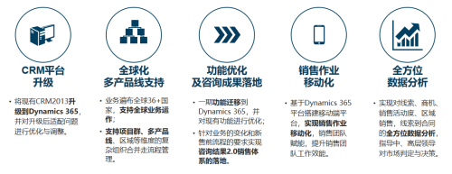 本次豐尚智能科技CRM項目將現(xiàn)有CRM2013升級到Dynamics 365,對公司系統(tǒng)架構(gòu)和功能做了統(tǒng)一的升級和優(yōu)化,充分考慮了豐尚科技全球化的布局以及服務(wù)全球行業(yè)領(lǐng)先客戶的需求,涵蓋歐洲、美洲和亞洲三大區(qū)域,建立了全球統(tǒng)一的數(shù)字化營銷管理服務(wù)平臺。此外,項目還將一期功能進(jìn)行遷移并進(jìn)行優(yōu)化的同時,針對業(yè)務(wù)的變化和新售前流程的要求進(jìn)行新需求的實施落地,對銷售團(tuán)隊工作進(jìn)行移動化管理,并實現(xiàn)從線索到合同的的全方位數(shù)據(jù)分析。
