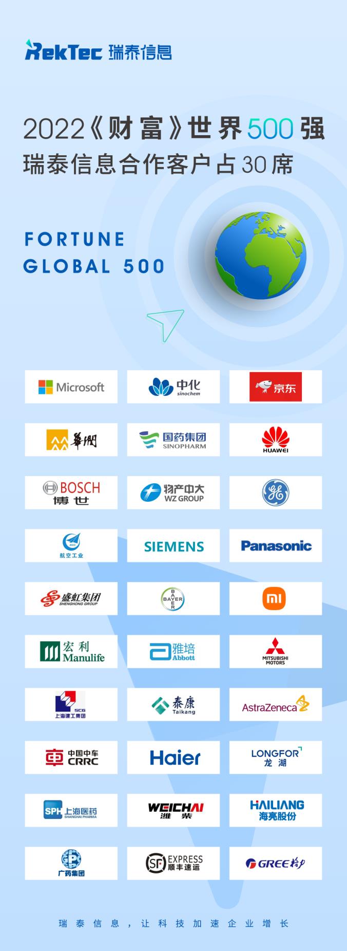 更加值得高興的是,瑞泰信息30家標桿合作客戶入榜世界500強。對此,瑞泰信息向所有合作客戶表達最真誠的祝福和最熱烈的祝賀!未來,瑞泰信息將攜手最優秀的行業巨擘,一起在數字化時代勇攀高峰,用科技的力量加速企業增長。