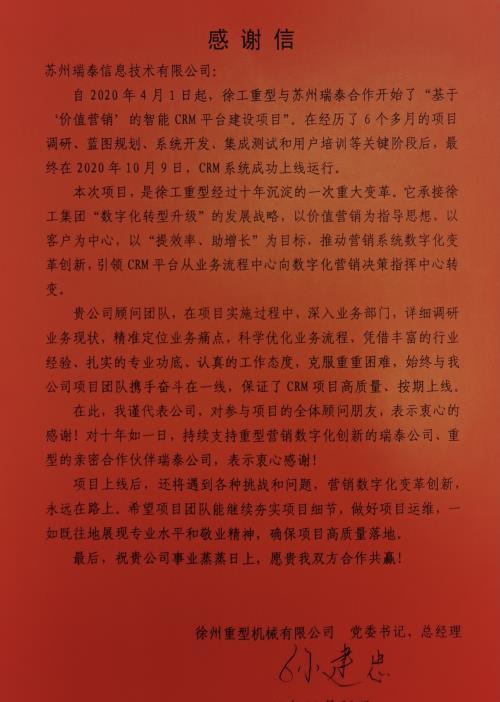 就在近日,瑞泰信息收到了徐州重型機械有限公司(以下簡稱:徐工重型)的感謝信,感謝瑞泰信息以專業水平和敬業精神,助力徐工重型客戶關系管理系統(CRM)項目成功上線運行!