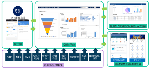 徐工重型CRM系統使用微軟Dynamics365CRM進行開發定制,充分考慮其業務寬度與廣度,涵蓋銷售LTC、服務ITR以及倉儲發運、備件后市場等所有圍繞客戶管理的應用,主要由市場管理、目標管理、客戶管理、商機管理、合同管理、發貨開票回款管理、儲運管理、呼叫中心、服務過程管理以及連接客戶的應用等模塊構成。通過IOT以及客戶移動端應用連接客戶、設備、駐外銷售人員、經銷商,實現客戶滿意度的提升以及整體協同效率的提升。