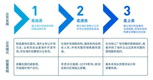 第三類:“走上去”的階段。這類企業(yè)通常是出海業(yè)務(wù)成熟的大型企業(yè)集團(tuán)。國內(nèi)和海外業(yè)務(wù)從研發(fā)、生產(chǎn)、供應(yīng)、采購、銷售、服務(wù)都各自獨(dú)立成體系。基于這種模式的出海業(yè)務(wù),會考慮海外業(yè)務(wù)基于本地化需要設(shè)計(jì)與部署,國內(nèi)業(yè)務(wù)基于國內(nèi)情況進(jìn)行設(shè)計(jì)與部署。此外,也要考慮集團(tuán)管控要求實(shí)現(xiàn)數(shù)據(jù)層面的打通以及數(shù)據(jù)分析需要。